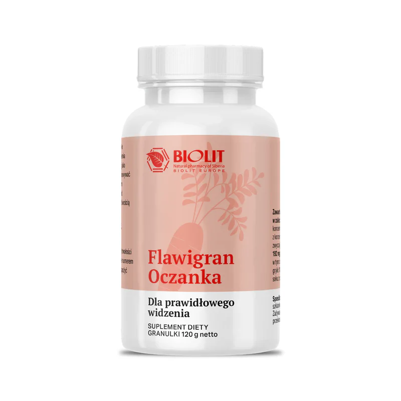 Flawigran oczanka zawiera: korzeń marchwi, koncentrat soku z marchwi, koncentrat z soku z rokitnika zwyczajnego, ekstrakt z owoców dzikiej róży, ekstrakt z borówki czernicy, ekstrakt gryki, ekstrakt świetlika lekarskiego, koncentrat soku z cytryny.